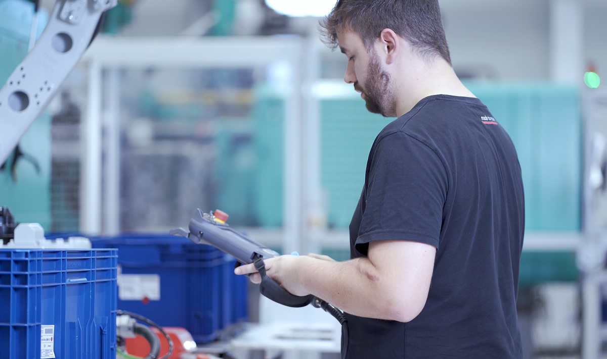 The base handling system from FMB used here is characterized by its consistent modularity. A standardized base module is equipped with an industrial robot suitable for the area of application. Various gripper and tool systems cover a wide range of applications, and standardized expansion and function modules allow the base to be adapted to specific processes. This means that the handling system can be quickly and economically tailored to the respective requirements. In addition, it can also be easily adapted or expanded for other processes for subsequent orders. A station system that ensures the energy supply makes the roller-mounted handling system mobile. In this way, it can be docked to additional stations and used to cover multiple processes at different locations and machines within the company with a single handling system. The "container feed" module used here provides storage areas for KLT containers directly on the handling system, into which the robot places the parts. The double gripper is precise and picks up two components at once. Since Chroff also produces parts on the same injection molding machine that can only be handled with a suction cup, the double gripper can be easily changed using a quick-change device.