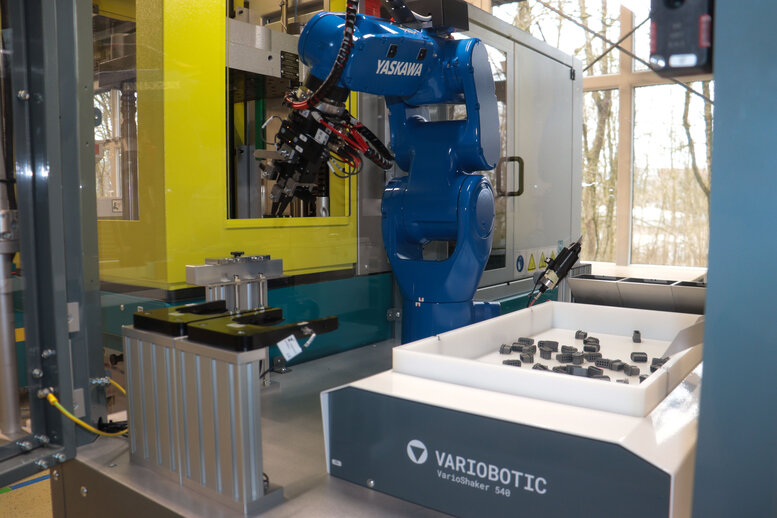 The VarioShaker 540 flexible part separator enables the efficient separation and feeding of unsorted components. The SensoPart V50 robotic vision system sends the coordinates of the correctly shaped and positioned components to the industrial robot, which picks up the part and inserts it into the injection moulding machine, via a prefabricated interface. The Yaskawa GP4 then removes the overmoulded workpiece from the BOY 35 EVH injection moulding machine. Consistent opening, placement, and removal times ensure minimal cycle time and reliable adherence to production schedules.