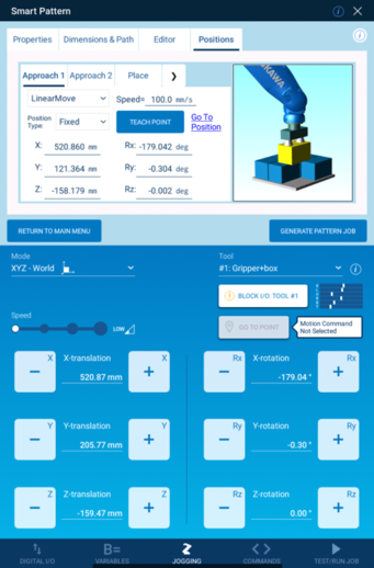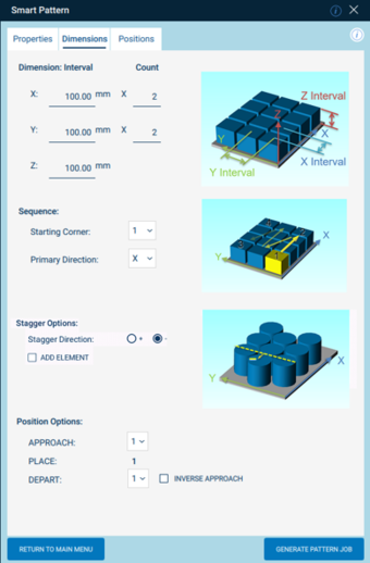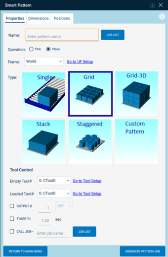 The Smart Pattern extension is a graphical interface for Smart Pendant to quickly generate jobs to handle parts in specific pattern(s). The interface supports common applications that require patterns (i.e. machine loading/unloading, stacking, unstacking, case packing, etc.)